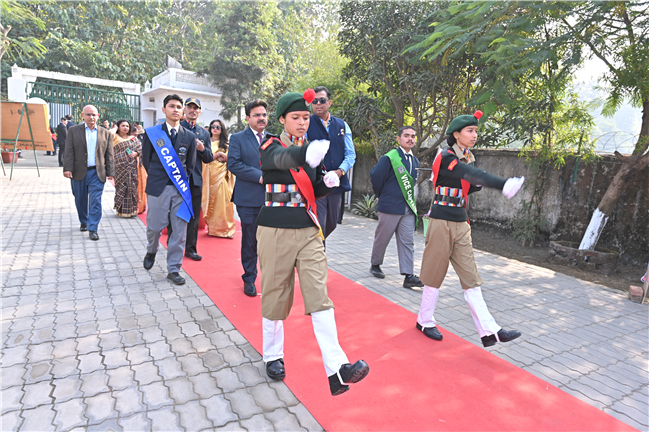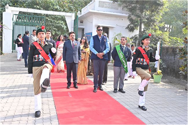The school family warmly welcomed the Chief Guest, Chief Education Officer, Mr. Govind Ram Jaiswal, at the commencement of the celebration. On this auspicious occasion, the school’s Managing Directors Mrs. Shalini Lal and Mr. Ravi Lal, Directors Mr. and Mrs. Erickson, and Principal Ms. Manral, along with all dignitaries, greeted the Chief Guest with a bouquet of flowers and extended their heartfelt welcome.